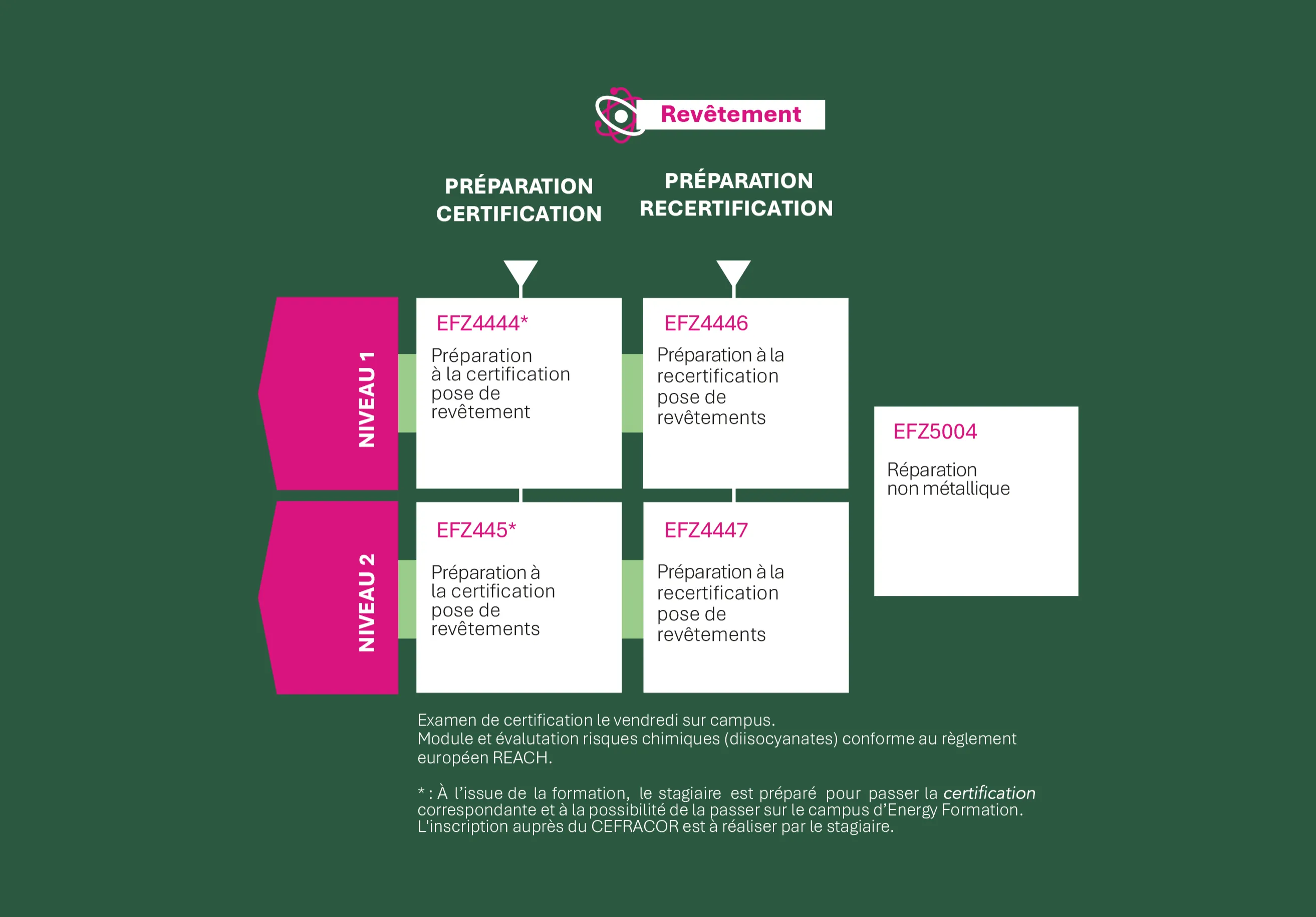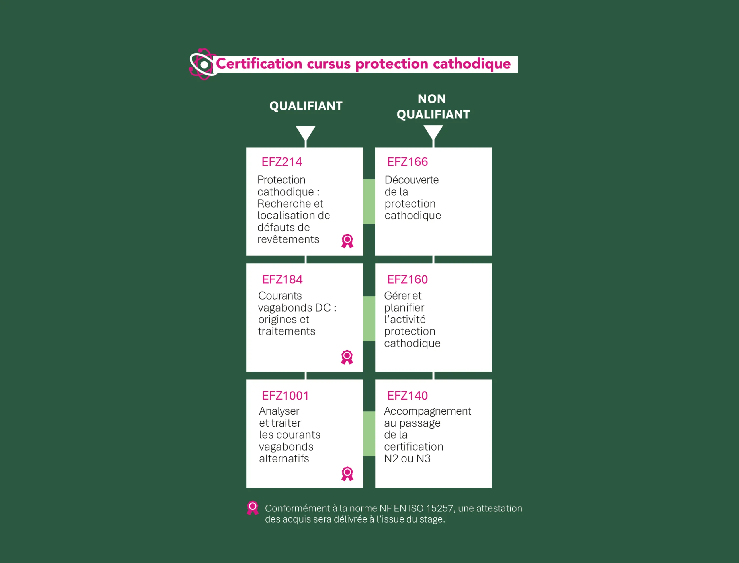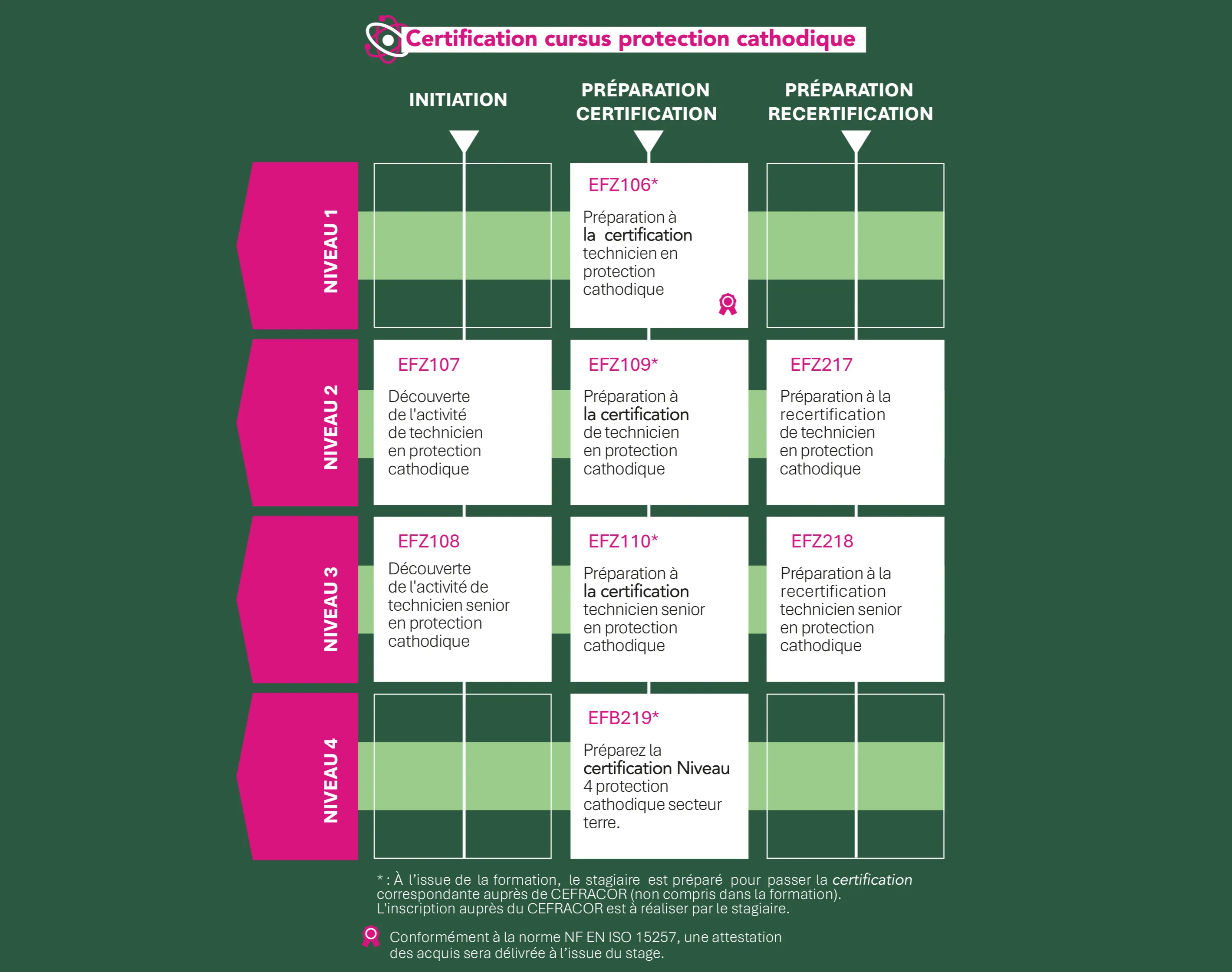 Nos formations suivent le référentiel de compétences de la norme NF EN ISO 15257 et préparent aux examens de certification correspondants par le Centre français de l’anticorrosion, CEFRACOR, organisme de certification spécialisé, reconnu et indépendant.